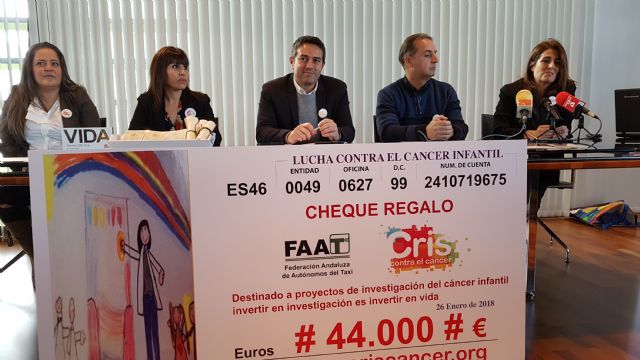 En cheque solidario lo ha recogido la directora de la Fundación Cris Contra el Cáncer, Marta Cardona y han estado presentes el presidente de la FAAT (Federación de Andalucía del Auto Taxi), Miguel Ruano, así como los presidentes de Radio Taxi Alcantarilla, José María Navarro, Tele Taxis ciudad de Murcia y Radio Taxi Cartagena.