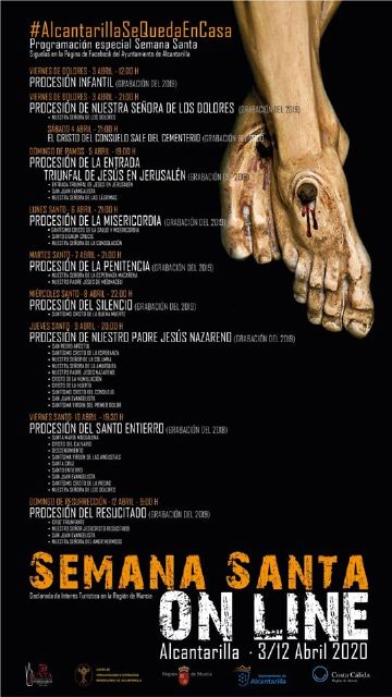 La iniciativa se ha puesto en marcha por el Ayuntamiento, contando con la Junta de Hermandades y Cofradías Pasionarias de Alcantarilla, para que los vecinos vivan esta celebración desde casa pero puedan rememorar los principales momentos de la Semana Santa de Alcantarilla, a través de las emisiones que grabó Alcantarilla TV.