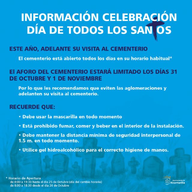 El Ayuntamiento de Alcantarilla ha lanzado una serie de recomendaciones para todas las personas que quieran acceder al Cementerio Municipal en las fechas cercanas al Día de Todos los Santos, entre las entre las que se encuentra anticipar la visita para evitar aglomeraciones.