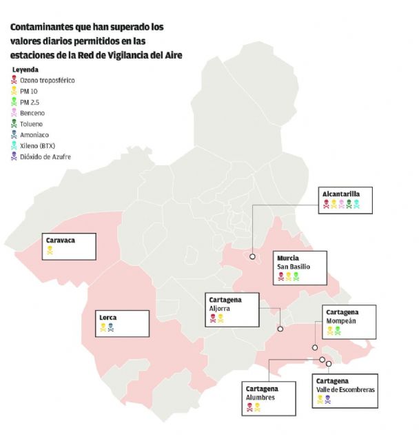 El informe de la calidad del aire en la Región que elabora cada año Ecologistas en Acción, vuelve a poner el acento en cómo un contaminante como el ozono troposférico amenaza con volverse crónico en Murcia y señala que desde hace tres años la Región de Murcia carece de un Plan de Mejora de la Calidad del Aire. Dentro del mapa de contaminación del informe, Alcantarilla aparece, desgraciadamente, como el municipio con mayor contaminación atmosférica de la Región. Las emisiones de Benceno, Tolueno y Xileno (BTX) volvieron a concentrarse, en su mayoría, durante 2021 en la estación medidora de Alcantarilla asociada al polo químico del municipio.