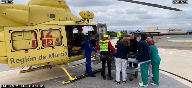 13:17 horas.- Informan que el helicóptero de la Dirección General de Seguridad y Emergencias, con bomberos rescatadores del Consorcio de Extinción de Incendios y Salvamento de la Región de Murcia, localizan con vida al desaparecido. Una vez que ha sido rescatado por bomberos rescatadores del CEIS, lo trasladan al Hospital Virgen de la Arrixaca.