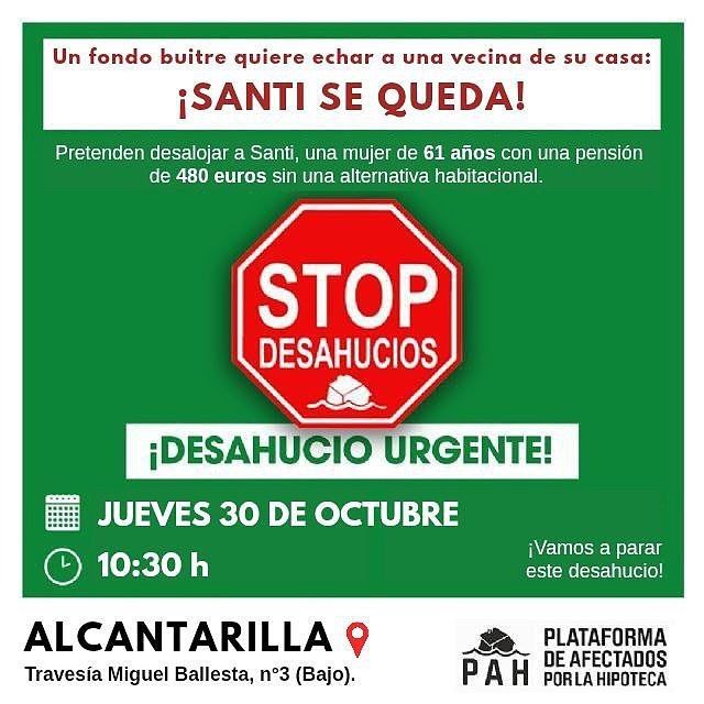Alcantarilla, miércoles 29 de octubre de 2025.- Izquierda Unida-Verdes de la Región de Murcia ha hecho un llamamiento a la ciudadanía para participar en la concentración convocada por la Plataforma de Afectadas por la Hipoteca y la Crisis (PAC), con el apoyo del Sindicato de Vivienda, para impedir el desahucio de Santi, una vecina de 61 años que vive en Alcantarilla y percibe apenas 480 euros de pensión al mes.